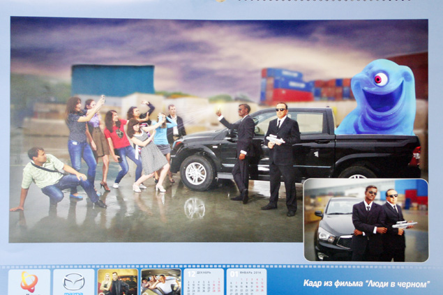 Немного странными получился кадр из фильма «Люди в черном». Негра, способного заменить Уилла Смита, во Владивостоке не нашлось, поэтому модель загримировали. Получилось неестественно. А вместо чудовищ из «MIB» на странице календаря красуется герой мультика «Монстры против пришельцев».