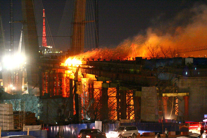 Следственными органами Следственного комитета Российской Федерации по Приморскому краю завершено расследование уголовного дела по факту пожара на мосту в городе Владивостоке в отношении монтажника по монтажу стальных и железобетонных конструкций ООО «Спец Монтаж-ДВ». Он обвиняется в совершении преступления, предусмотренного ч. 1 ст. 216 УК РФ (нарушение правил безопасности при проведении строительных работ). Об этом сообщила старший помощник руководителя СКР по Приморскому краю Аврора Римская.По версии следствия, 12 декабря 2011 года на мостовом переходе строительного объекта «Строительство мостового перехода через бухту Золотой рог на автомагистрали, связывающей федеральную дорогу М-60 Хабаровск – Владивосток с о. Русский, монтажник осуществлял газосварочные работы, проводить которые право не имел. Обвиняемый надрезал металлическую балку, поддерживающую деревянные элементы опалубки пролета, в результате чего образовались раскаленные до высокой температуры частицы металла. После этого, не проверив должным образом рабочее место на предмет отсутствия искр и раскаленного металла, способных вызвать пожар, обвиняемый покинул рабочее место. Пожар возник от частиц раскаленного металла, попавших непосредственно под анкерный пролет мостового строения в районе бетонной опоры № 11, где и произошло возгорание горючих материалов: бруса и настила из фанеры.